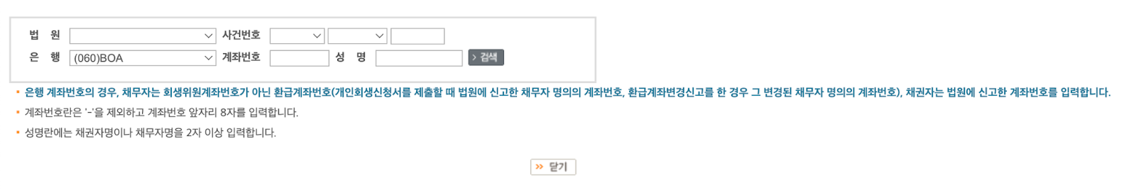 계좌번호는 변제금을 납부하고 있는 회생 위원 계좌번호가 아닌 본인 소유의 환급계좌를 입력해야 합니다. - 변제 현황 확인